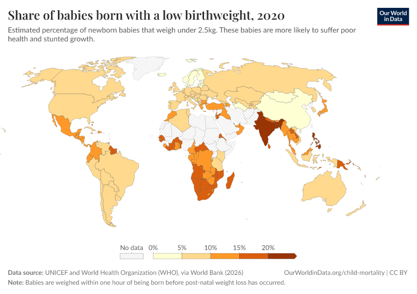 UNICEF and World Health Organization (WHO), via World Bank (2026) – processed by Our World in Data. “Share of babies born with a low birthweight” [dataset]. UNICEF and World Health Organization (WHO), via World Bank, “World Development Indicators 125” [original data]. Retrieved March 3, 2026 from https://country-profiles-in-search.owid.pages.dev/grapher/share-of-low-birthweight-babies-born