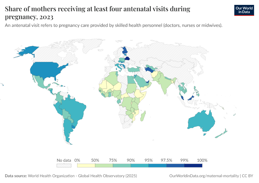 “Data Page: Share of mothers receiving at least four antenatal visits during pregnancy”. Our World in Data (2026). Data adapted from World Health Organization. Retrieved from https://country-profiles-in-search.owid.pages.dev/grapher/share-of-mothers-receiving-at-least-four-antenatal-visits-during-pregnancy [online resource]How to cite this data