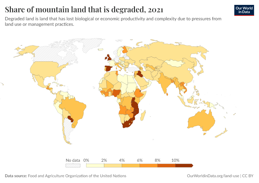 “Data Page: Share of mountain land that is degraded”. Our World in Data (2026). Data adapted from Food and Agriculture Organization of the United Nations. Retrieved from https://country-profiles-in-search.owid.pages.dev/grapher/share-of-mountain-land-that-is-degraded [online resource]How to cite this data