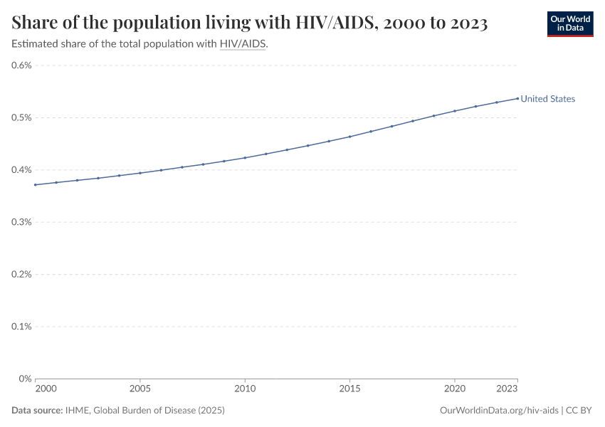 IHME, Global Burden of Disease (2025) – with major processing by Our World in Data. “Share of the population living with HIV/AIDS” [dataset]. IHME, Global Burden of Disease, “Global Burden of Disease - Prevalence and Incidence” [original data]. Retrieved March 3, 2026 from https://country-profiles-in-search.owid.pages.dev/grapher/share-of-the-population-living-with-hivaids