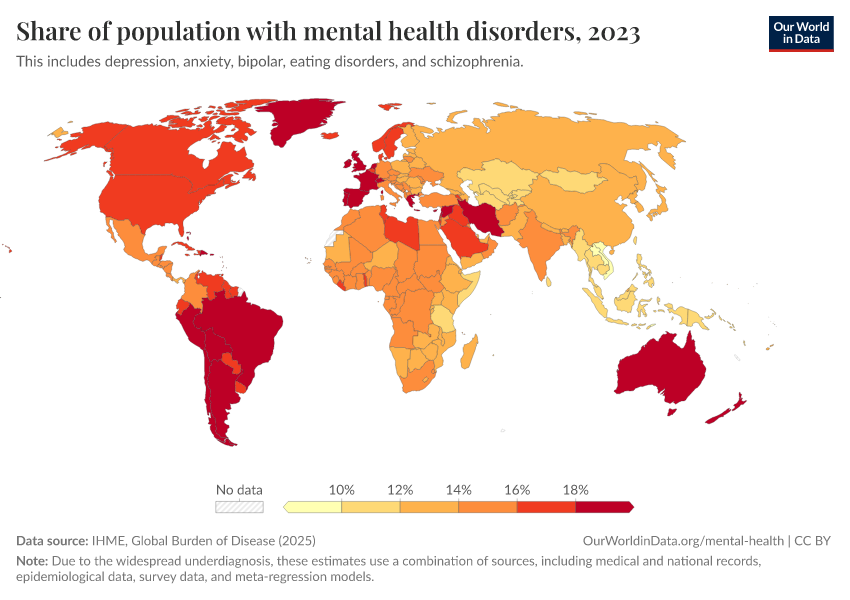 IHME, Global Burden of Disease (2025) – with major processing by Our World in Data. “Share of population with mental health disorders” [dataset]. IHME, Global Burden of Disease, “Global Burden of Disease - Prevalence and Incidence” [original data]. Retrieved March 3, 2026 from https://country-profiles-in-search.owid.pages.dev/grapher/share-with-mental-and-substance-disorders