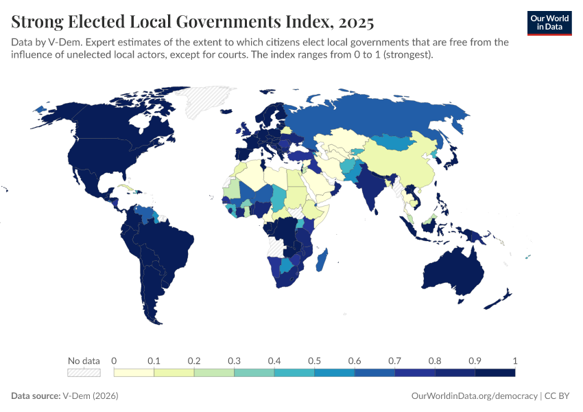 V-Dem (2025) – processed by Our World in Data. “Elected local governments – V-Dem” [dataset]. V-Dem, “Democracy report v15” [original data]. Retrieved March 3, 2026 from https://country-profiles-in-search.owid.pages.dev/grapher/strong-elected-local-governments-index