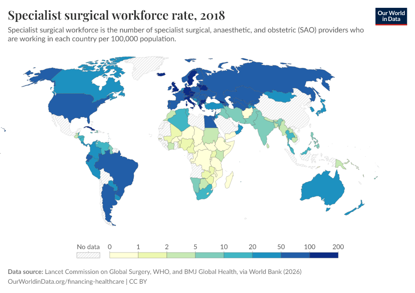 Lancet Commission on Global Surgery, WHO, and BMJ Global Health, via World Bank (2026) – processed by Our World in Data. “Specialist surgical workforce rate” [dataset]. Lancet Commission on Global Surgery, WHO, and BMJ Global Health, via World Bank, “World Development Indicators 125” [original data]. Retrieved March 3, 2026 from https://country-profiles-in-search.owid.pages.dev/grapher/surgeons-per-100000