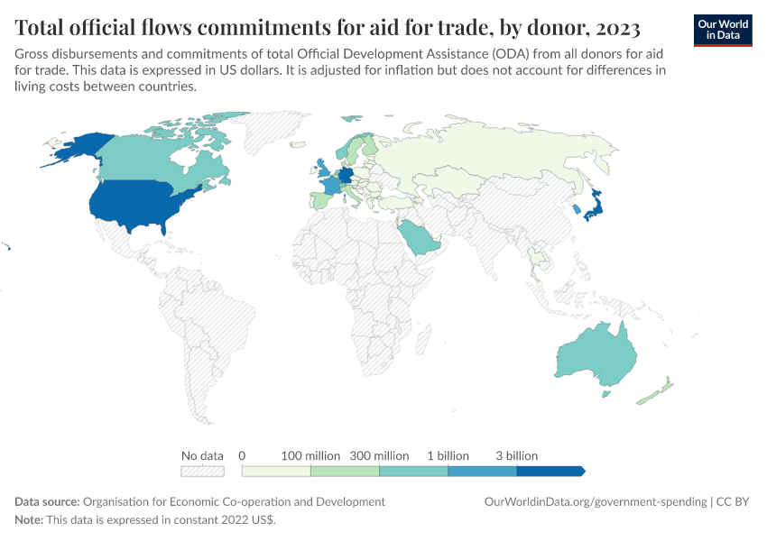 “Data Page: Total official flows commitments for aid for trade, by donor”. Our World in Data (2026). Data adapted from Organisation for Economic Co-operation and Development. Retrieved from https://country-profiles-in-search.owid.pages.dev/grapher/total-oda-for-aid-for-trade-by-donor [online resource]How to cite this data