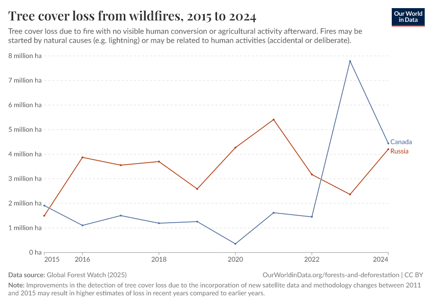 Global Forest Watch (2025) – with major processing by Our World in Data. “Tree cover loss from wildfires” [dataset]. Global Forest Watch, “Tree Cover Loss by Dominant Driver” [original data]. Retrieved March 3, 2026 from https://country-profiles-in-search.owid.pages.dev/grapher/tree-cover-loss-from-wildfires
