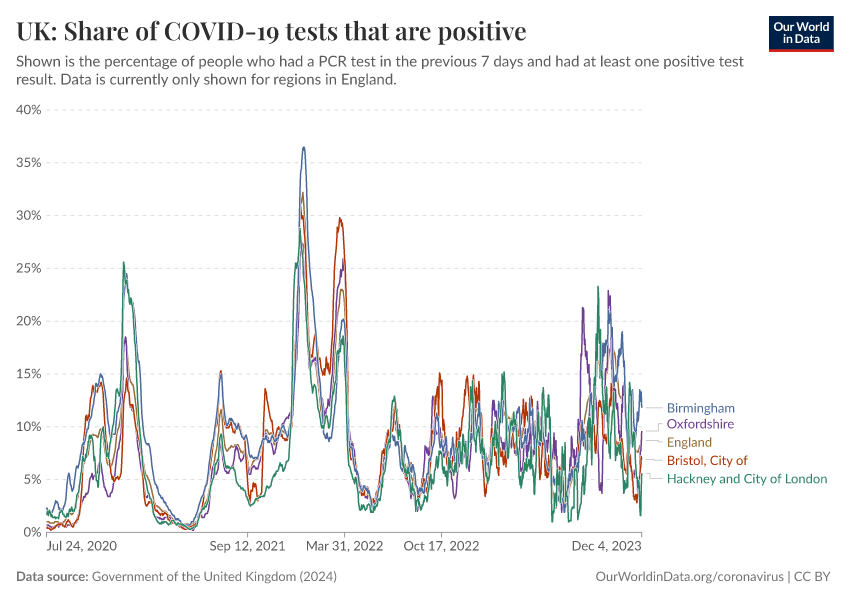 Government of the United Kingdom (2024) – with minor processing by Our World in Data. “UK: Share of COVID-19 tests that are positive” [dataset]. Government of the United Kingdom, “UKHSA data dashboard” [original data]. Retrieved March 3, 2026 from https://country-profiles-in-search.owid.pages.dev/grapher/uk-covid-positivity