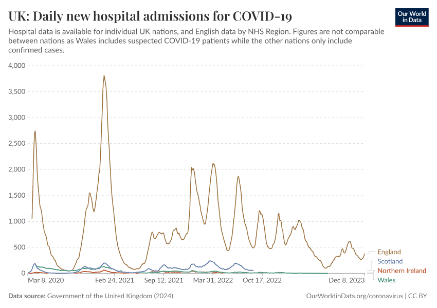 Government of the United Kingdom (2024) – with minor processing by Our World in Data. “UK: Daily new hospital admissions for COVID-19” [dataset]. Government of the United Kingdom, “UKHSA data dashboard” [original data]. Retrieved March 3, 2026 from https://country-profiles-in-search.owid.pages.dev/grapher/uk-daily-covid-admissions
