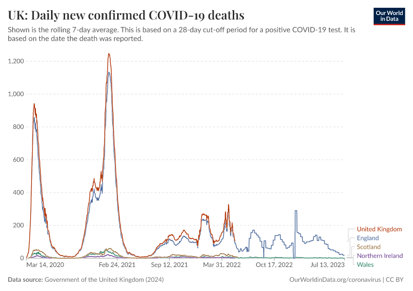 Government of the United Kingdom (2024) – with minor processing by Our World in Data. “UK: Daily new confirmed COVID-19 deaths” [dataset]. Government of the United Kingdom, “UKHSA data dashboard” [original data]. Retrieved March 3, 2026 from https://country-profiles-in-search.owid.pages.dev/grapher/uk-daily-covid-deaths