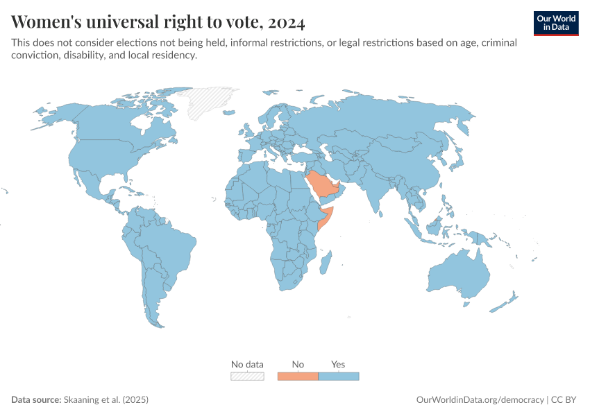 Skaaning et al. (2025) – processed by Our World in Data. “Women's universal right to vote” [dataset]. Skaaning et al., “Lexical Index of Electoral Democracy (LIED) v6.8” [original data]. Retrieved March 3, 2026 from https://country-profiles-in-search.owid.pages.dev/grapher/universal-suffrage-women-lexical