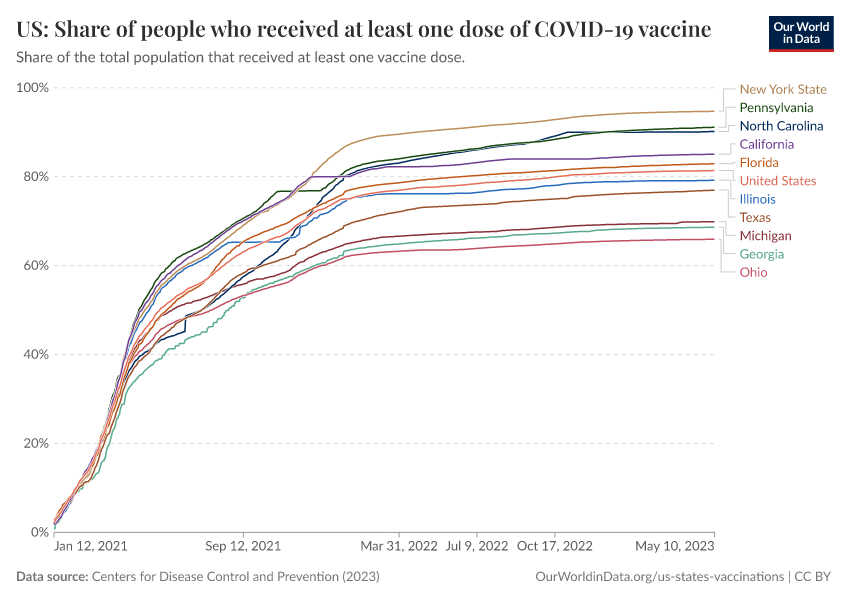 Centers for Disease Control and Prevention (2023) – processed by Our World in Data. “US: Share of people who received at least one dose of COVID-19 vaccine” [dataset]. Centers for Disease Control and Prevention, “COVID-19, Vaccinations (United States)” [original data]. Retrieved March 3, 2026 from https://country-profiles-in-search.owid.pages.dev/grapher/us-covid-19-share-people-vaccinated