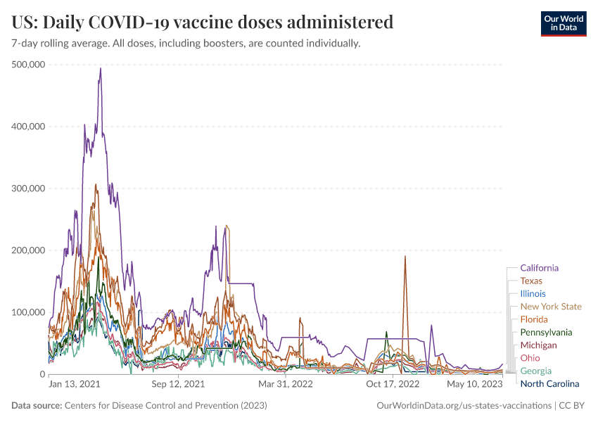 Centers for Disease Control and Prevention (2023) – processed by Our World in Data. “US: Daily COVID-19 vaccine doses administered” [dataset]. Centers for Disease Control and Prevention, “COVID-19, Vaccinations (United States)” [original data]. Retrieved March 3, 2026 from https://country-profiles-in-search.owid.pages.dev/grapher/us-daily-covid-vaccine-doses-administered