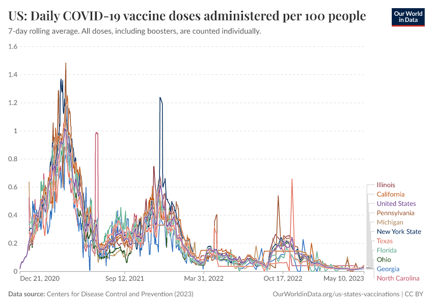 Centers for Disease Control and Prevention (2023) – processed by Our World in Data. “US: Daily COVID-19 vaccine doses administered per 100 people” [dataset]. Centers for Disease Control and Prevention, “COVID-19, Vaccinations (United States)” [original data]. Retrieved March 3, 2026 from https://country-profiles-in-search.owid.pages.dev/grapher/us-daily-covid-vaccine-doses-per-100