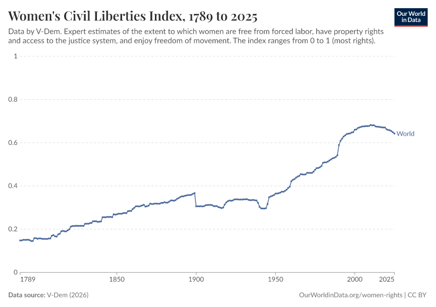V-Dem (2025) – processed by Our World in Data. “Women's civil rights index – V-Dem” [dataset]. V-Dem, “Democracy report v15” [original data]. Retrieved March 3, 2026 from https://country-profiles-in-search.owid.pages.dev/grapher/women-civil-liberties-index
