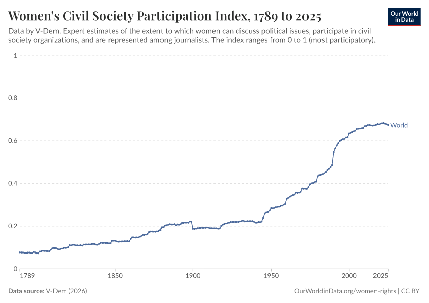 V-Dem (2025) – processed by Our World in Data. “Women's civil society participation index – V-Dem” [dataset]. V-Dem, “Democracy report v15” [original data]. Retrieved March 3, 2026 from https://country-profiles-in-search.owid.pages.dev/grapher/women-civil-society-participation-index