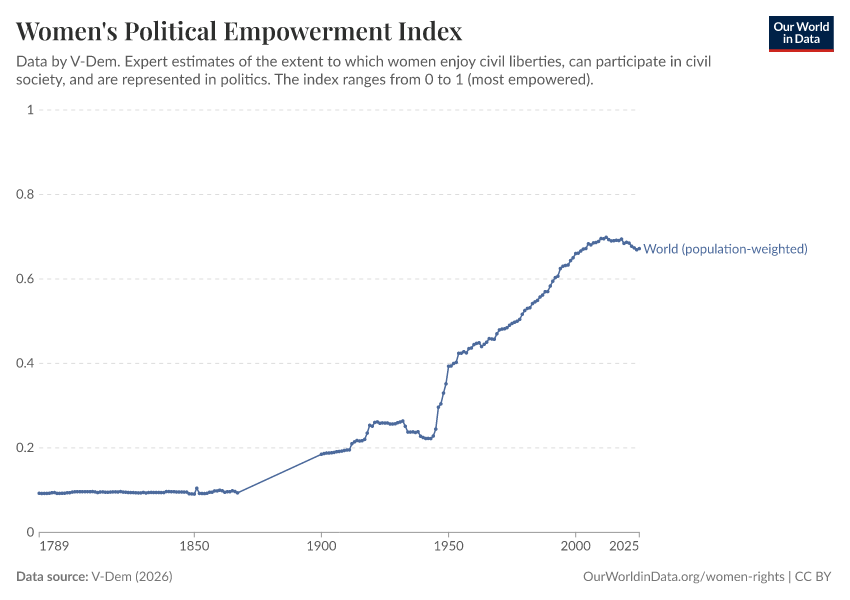 V-Dem (2025) – processed by Our World in Data. “Women's political empowerment index – V-Dem” [dataset]. V-Dem, “Democracy report v15” [original data]. Retrieved March 3, 2026 from https://country-profiles-in-search.owid.pages.dev/grapher/women-political-empowerment-index