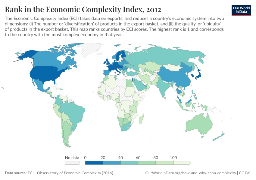 Loosely speaking, the least complex countries, at the bottom of the ECI rank, are those that export very few different types of products (i.e. have export baskets that are not diversified) and those products that they do export are produced in many other countries (i.e. export baskets that load heavily on just a few ubiquitous products).