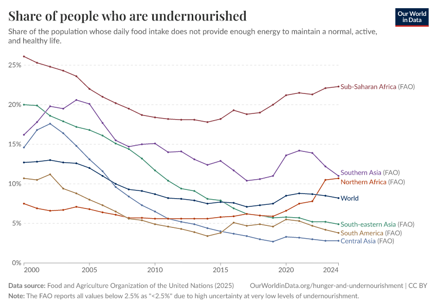 Hannah Ritchie, Pablo Rosado, and Max Roser (2023) - “Hunger and Undernourishment” Published online at OurWorldinData.org. Retrieved from: 'https://country-profiles-in-search.owid.pages.dev/hunger-and-undernourishment' [Online Resource]BibTeX citation