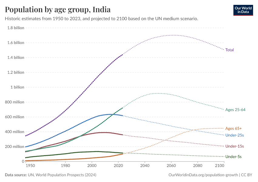 The chart here shows India’s population – split by age groups – from 1950 onwards, combined with the UN’s medium projection to 2100.