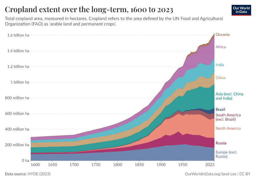 This visualization shows total cropland (which does not include land for grazing) over the long term, measured in hectares.