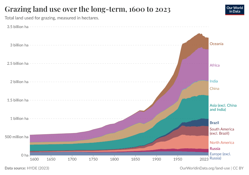 This visualization shows total grazing land over the long term, measured in hectares.