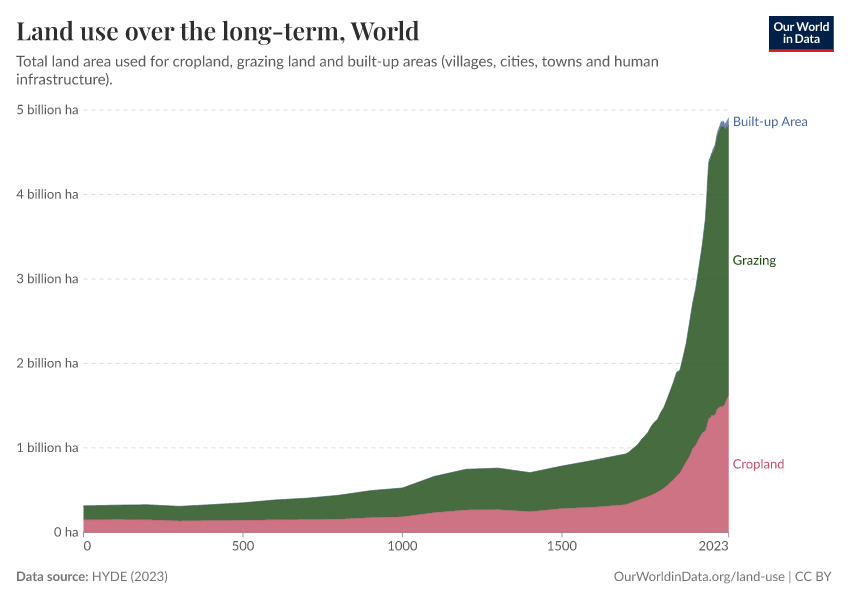 This visualization shows the total land used for agriculture (which is a combination of cropland and grazing land) over the long term, measured in hectares. In the following sections, you can find disaggregated data on cropland and grazing land change over time.
