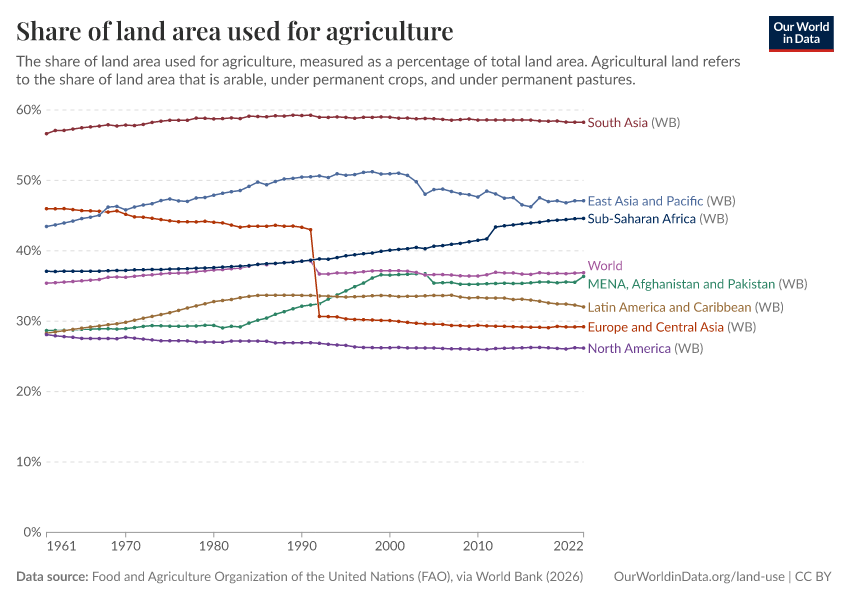 If we view the map in "chart" mode, we see how the allocation of land to agriculture has changed over time across the global regions. The share of land used for agriculture has been slowly increasing across most of the world's regions over the past few decades. However, land use across Europe and Central Asia- particularly within the European Union (EU) zone- and North America has been declining.