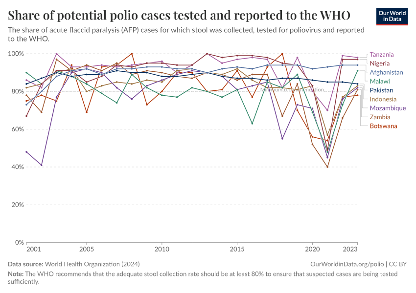 To do this, we look at the percentage of paralysis cases that have stool samples taken to test for polio. The higher this percentage, the more potential cases are being tested to confirm whether they are infected by the poliovirus.