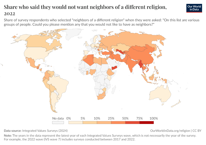 Another way to understand people’s tolerance or trust is to ask whether they would or would not want particular groups as neighbors. In the chart below, you can see the share of people who said they would not want neighbors who followed a different religion from them.