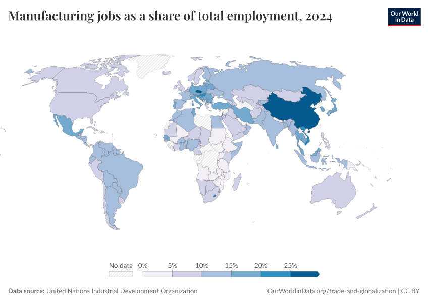 This indicator measures the manufacturing sector's employment as a share of the country's total employment. Employment refers to all persons of working age who, during a specified brief period, were in paid employment (whether at work or with a job but not at work) or in self-employment (whether at work or with an enterprise but not at work).