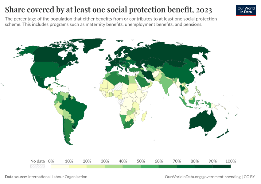 This indicator measures the share of the population effectively covered by a social protection system. Such systems include child and maternity benefits, support for persons without jobs, persons with disabilities, victims of work injuries, and older persons.
