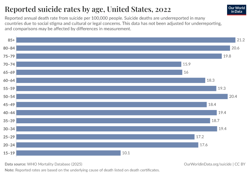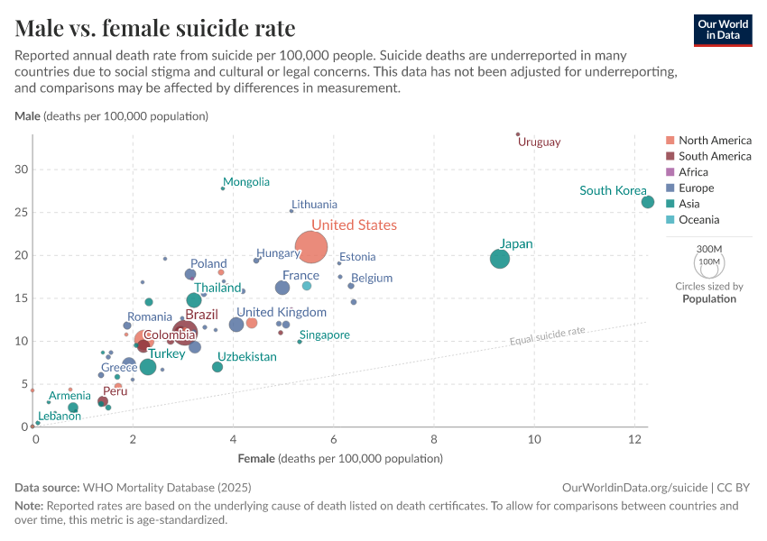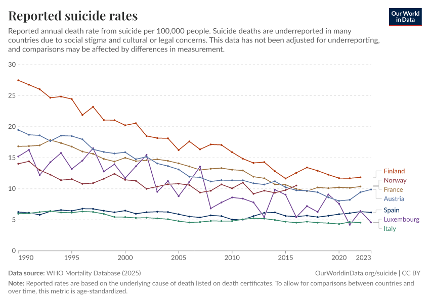 Saloni Dattani, Lucas Rodés-Guirao, Hannah Ritchie, Max Roser, and Esteban Ortiz-Ospina (2023) - “Suicides” Published online at OurWorldinData.org. Retrieved from: 'https://country-profiles-in-search.owid.pages.dev/suicide' [Online Resource]BibTeX citation