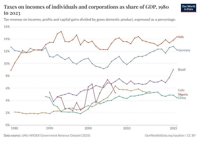 The next visualization provides an overview of revenues from income taxation (specifically taxes on incomes, profits, and capital gains) over recent decades. The estimates correspond to direct taxation of individuals and corporations and are expressed as a share of GDP.
