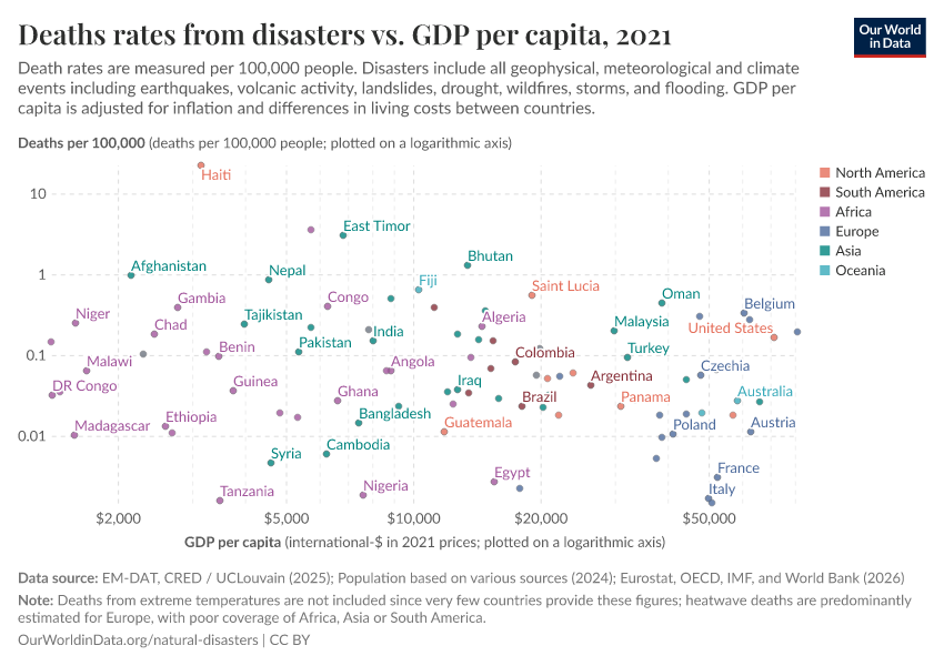 Hannah Ritchie (2024) - “The world has become more resilient to disasters, but investment is needed to save more lives” Published online at OurWorldinData.org. Retrieved from: 'https://country-profiles-in-search.owid.pages.dev/the-world-has-become-more-resilient-to-disasters-but-investment-is-needed-to-save-more-lives' [Online Resource]BibTeX citation