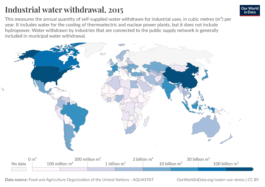 Industrial water withdrawal: "Annual quantity of self-supplied water withdrawn for industrial uses. It can include water from primary renewable and secondary freshwater resources, as well as water from over-abstraction of renewable groundwater or withdrawal from fossil groundwater, direct use of agricultural drainage water, direct use of (treated) wastewater, and desalinated water. This sector refers to self-supplied industries not connected to the public distribution network. The ratio between net consumption and withdrawal is estimated at less than 5%. It includes water for the cooling of thermoelectric and nuclear power plants, but it does not include hydropower. Water withdrawn by industries that are connected to the public supply network is generally included in municipal water withdrawal."