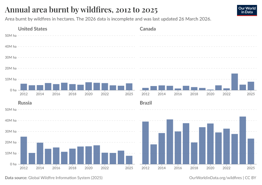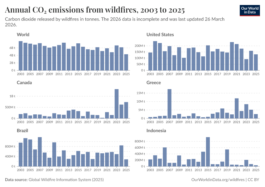 Veronika Samborska and Hannah Ritchie (2024) - “Wildfires” Published online at OurWorldinData.org. Retrieved from: 'https://country-profiles-in-search.owid.pages.dev/wildfires' [Online Resource]BibTeX citation